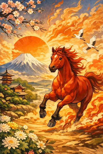 jin-ovw• 12日前2026年 丙午年(ひのえうま) ― 変化を恐れず、流れを掴む一年へ2026年 丙午年(ひのえうま) 「赤い馬の年」日本向け総合運勢レポート --- 1. 2026年・丙午年の基本的な意味(日本的解釈) 2026年は、六十干支の43番目にあたる 丙午(ひのえうま) の年です。 十干「丙」と十二支「午」は、どちらも強い 火の気 を持ち、 日本では古くから 激動・転換・表面化 を象徴する年とされてきました。 東洋占術的な象意: 火のエネルギーが極まり、物事が一気に動き出す年。 隠されていた問題・感情・構造が表に出やすく、 良くも悪くも「ごまかしが効かない」一年です。 *009