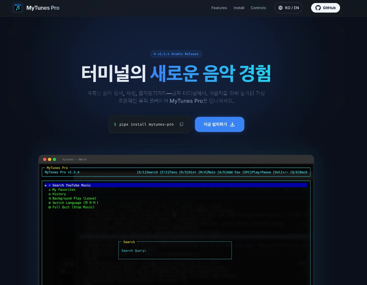 jin-ovw• 1개월 전 (edited)터미널창에서 음악을 들어요-사이트소개터미널 창에서 음악을 들어요 MyTunes Pro 터미널에서 유튜브 음악 검색에서 재생 까지 Mac OS, Window , Linux 까지 공유 라이브 공식사이트 !clipboard-1769276873198.png0012
